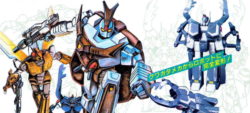 Aramaki was apparently inspired a bit by Takara’s earlier Insect Robo toys, or perhaps inspired to do better than them, because those toys, as he put it, “don’t really look like insects.” What started off as a bit of one-upmanship by mechanical designers (Aramaki also did work for Takara on Diaclone) took a turn for the ironic when both Insect Robo and Beetras toys found their way into Hasbro’s Transformers toy line overseas.